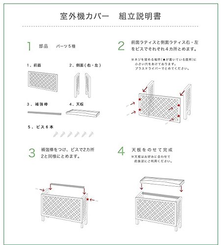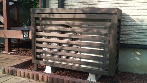 - 室外機カバー匠の特長。 ★モデルルーム、設計事務所様に好評のプロ仕様。 ★大型室外機カバーのため、合わせやすい大きさです。(内寸:幅92cm×奥行41cm×高さ67cm) ★6箇所をビス留めするだけで完成。プラスドライバーで組立可能。 ★使用している米国産ヒバ材※は大変腐りにくく、天然木でありながら高耐久性を確保。 ★厚みのある無垢材を使用。中の桟は板厚13ミリのものを交差させているため、重厚感があり、高耐久。