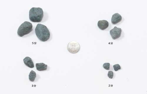 - 市販のものより硬度の高い岩(国産・四国)を砕石して丸めています。石が硬いと、粉が出にくく、風化しにくいのが特長です。