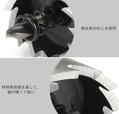 - 各サイズごとに、カッター、センタードリル、センタースプリング、六角レンチがセットになっています 。