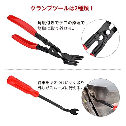 - プライヤー型のクリップ外しはデコ原理で奥まった場所もご使用いただけます。ドライバー型のクリップ外しは傷つきにくく、力もいりません。金属製で強度が一番強いので強い力が必要な時にも頼りになります。奥まった箇所のクリップの取外や、内張りはがし、ルームランプの交換、オーディオパネルの取外やサービスホールのキャップ取外等に最適。