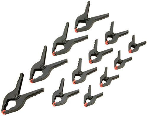 These spring clamps are unbeatable for securing glue joints, clamping jigs, holding down tarps, or hundreds of other shop chores that require an extra hand. Handles are contoured for comfort and control. Non-marring jaws pivot to increase their grip on uneven surfaces. Tough polymer construction. Includes four each of 1-Inch, 2-Inch and 3-Inch spring clamps.