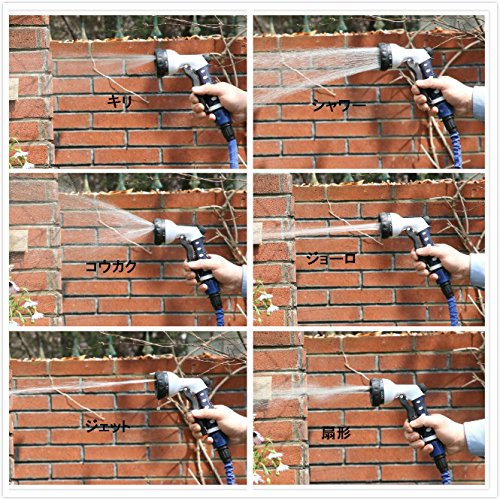 - 頑丈性と伸縮性抜群:ホースは通水後、5Mから15Mまでぐんぐん伸び~る(水圧によると伸びる長度が違う)、水が抜けると元の5m長さに戻るで片付けもラクラク。