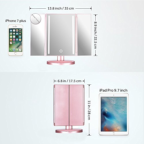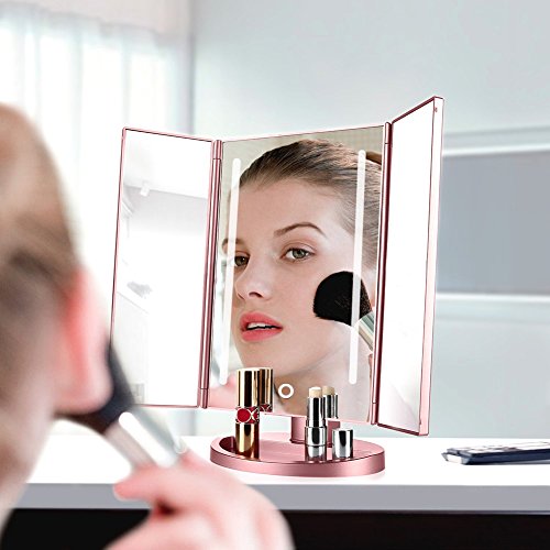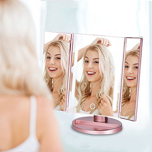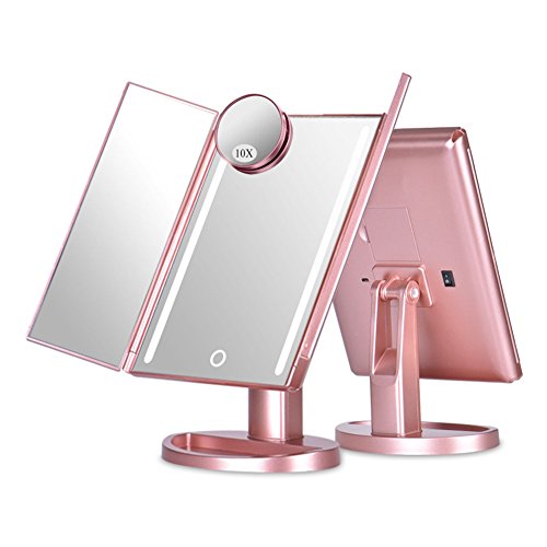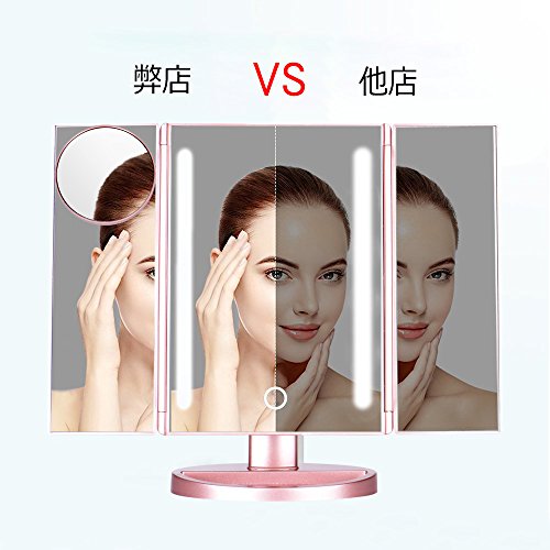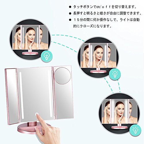 化粧鏡 LED女優ミラー WUUDI 鏡 卓上 LED三面鏡 折りたたみ式 10倍拡大鏡付き 明るさ調節可能 無階 180度回転 USB/単三電池給電 プレゼント(ローズ金)