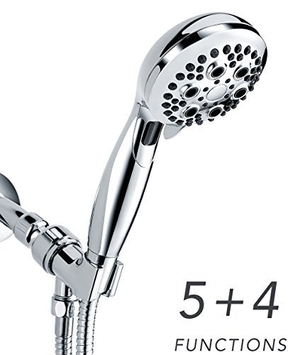 This Handheld anti-leak design showerhead is made of high quality Durable ABS and CHROME finish all over- never tarnish and resisting spots.ANGLE-ADJUSTABLE OVERHEAD BRACKET Lets you point hand shower where you want it for hands-free operation at desired angle .Super-FLEXIBLE Long 150cm STAINLESS STEEL HOSE, Great for washing kids and pets.One finger Control easily snap into place to identify spray modes.9 different setting and combinations provide a total customised shower experience.Ecospray Push Button and Water Saving Pause Mode is great for saving water in RVs and boats.