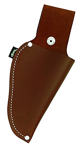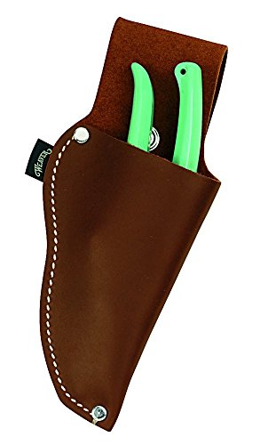 Hold hand pruners snugly in place without snaps or straps lock stitched and riveted soft Brown oil tanned top grain steer hide leather construction. fits 9" pruners, has a 6" deep pocket. has an optional 3" knife pouch. ( item # 08-97202-9p belt loop snaps over belts up to 2" wide. nickel plated hardware.