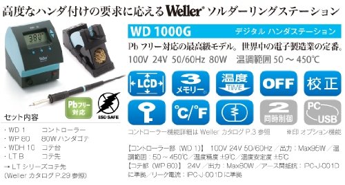 ●セット内容:WD1(コントローラー)、WP80(80Wハンダゴテ)、WDH10(コテ台)、LT-B(コテ先)●電源:100V 24V 50/60Hz 80W●温調範囲:50~450℃●Pbフリーハンダ対応の最高級モデル。世界中の電子製造業の定番●設定温度が見やすい大型液晶パネル採用●3種の温度を記憶、簡単呼出。温度は50~450℃迄設定可能●入力時間経過後(0~99分間)コテ先温度を下げてスタンバイ。●入力時間経過後(0~999分間)ヒーターへの電力供給中止。省資源と安全対策に貢献●表示温度を±40℃の幅で温度校正が可能●3桁の暗証番号で温度ロック可能●用途に応じて、温度表示(摂氏/華氏)切替可能●デバイスへの電気的ダメージを最小限に防ぐ為にポテンシャルバランス回路を形成●ヒーター部に大容量蓄熱部搭載、急激な温度ドロップを抑制、コテ先の温度安定化を実現●センサー部にプラチナセンサーを搭載。熱伝導性が高い銀コアとの組合で温度復帰力を高める●消耗部コテ先の小型化が実現、省資源化を図ってます。