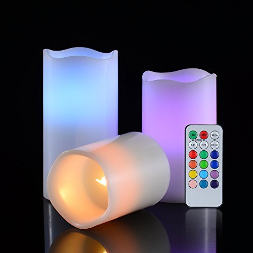 キャンドルライト3個セット単4形電池式(別売り)ledろうそく燈、リモコン機能、4/8時間を自動消燈設定、12カラー変換可能、本物蝋燭作り、癒しの雰囲気ライト、無火炎、無煙、安全な室内飾りの灯 、パーティー、祈願、誕生日、記念日や結婚式により良い雰囲気作りが最適、直径:7.5cm、高さ:10/12.5/15cm