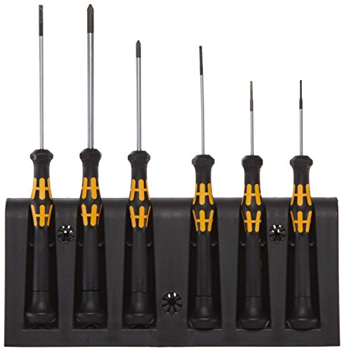 Wera Kraftform ESD 6 Piece Electronic Screwdriver Set is designed to protect components against static electricity. Wera Exceeds required specifications for ESD Safe products to protect components against static electricity and associated damage. Kraftform Micro handle features the shape that facilitates high torque transfer and precision feel for fine adjustment work. Hand support on Convex/concave cap offers both an easy turning action and comfortable hand rest. The slim fast-turning zone, beneath the cap, accelerates the screw-driving process and reduces time-consuming grip adjustments. Integrated soft zones in handle bulge, transfer high tightening/loosening forces without losing contact with screws. Precision zone at blade provides better feel for rotational angle during fine adjustment work. Wera black point Tip and hardening process guarantee long service life and increased corrosion protection. Anti-roll protection stops screwdrivers from rolling away at the workplace. Limited Life Time Warranty. Set contains 6 Micro Screwdrivers: 4 Slotted - 0.05”, 1/16”, 0.07”, 3/32” and 2 Phillips - PH0, PH1. Includes wall-mounting rack for convenient storage and tool retrieval. Wera ? The Best Tools For The Job!