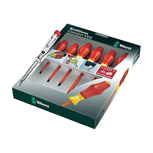 Wera Kraftform Comfort Insulated 7 Piece Screwdriver set is the economic screwdriver for the Professional user. Wera Comfort hand tools feature the trademarked ergonomic multi-component Kraftform handle that fits the shape to the hand for quick and effortless working. Hexagon bolster provides extra torque transfer with use of open-jawed or ring spanner. Handle marking on top of handle include screw symbol and size of tip to easily find the right screwdriver in your toolbox or workplace. Anti-roll protection at base of handle stops screwdrivers from rolling away at workplace. Limited Life Time Warranty. Set contains 4 Slotted - 3/32”, 9/64”, 5/32”, 7/32”; 2 Phillips - PH1 and PH2 and voltage tester. Wera ? The Best Tools For The Job!