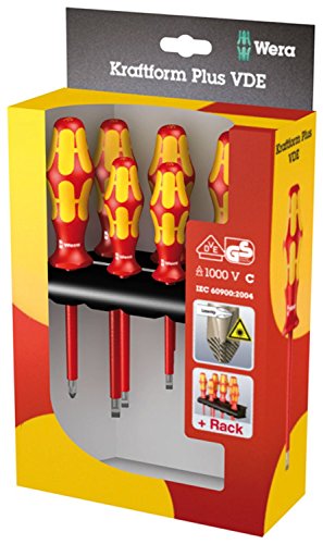 Wera Kraftform 6 Piece Insulated Screwdriver set is designed for the Professional user. Each screwdriver is put through vigorous testing in a water bath at 10,000 volts to guarantee safe working standards of 1,000 Volts. Lasertip micro-rough drive tip bites into the fastener to ensure a perfect fit and reduce cam-out effect. All Wera hand tools feature the trademarked ergonomic Kraftform handle, with hard and soft zones, that fits the shape to the hand for the ultimate in comfort and high-speed torque transfer. Handle marking on top of handle includes screw symbol and size of tip to easily find the right screwdriver in your toolbox or workplace. Anti-roll protection at base of handle stops screwdrivers from rolling away at workplace. Limited Life Time Warranty. Set contains 2 Slotted screwdrivers - 0.6x3.5x100, 1x5.5x125. 2 Phillips screwdrivers - PH1, PH2. 2 Square screwdrivers - #1, #2. Includes wall-mounting rack for convenient storage and tool retrieval. Wera ? The Best Tools For The Job!