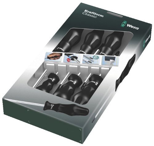 Wera Kraftform Classic 6 Piece Screwdriver set is designed for the do-it-yourself user. Wera Classic hand tools feature the Kraftform one-component handle that fits the shape to the hand so the whole hand is in contact with the handle, erasing the physical stresses of screwdriving. Wera Black Point tip and hardening process guarantee a long service life and increased corrosion protection. Anti-roll protection at base of handle stops screwdrivers from rolling away at workplace. Limited Life Time Warranty. Set contains 4 Slotted - 9/64”, 5/32”, 7/32”, 1/4' and 2 Phillips - PH1 and PH2. Wera ? The Best Tools For The Job!