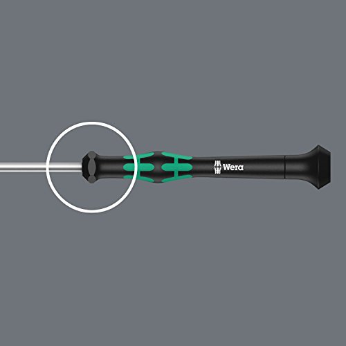 Wera Kraftform Micro 6 Piece Hex Nutdriver Electronic Screwdriver Set is designed to reduce the fastening time and cost per screw connection. Kraftform Micro handle features the shape that facilitates high torque transfer and precision feel for fine adjustment work. Hand support on Convex/concave cap offers both an easy turning action and comfortable hand rest. The slim Fast-turning zone, beneath the cap, accelerates the screw-driving process and reduces time-consuming grip adjustments. Integrated soft zones in handle bulge, transfer high tightening/loosening forces without losing contact with screws. Precision zone at blade provides better feel for rotational angle during fine adjustment work. Wera black point Tip and hardening process guarantee long service life and increased corrosion protection. Anti-roll protection stops screwdrivers from rolling away at the workplace. Limited Life Time Warranty. Set contains 6 Ball-end Hex Micro Screwdrivers - 2.0mm, 2.5mm, 3.0mm, 3.5mm, 4.0mm and 5.0mm. Includes wall-mounting rack for convenient storage and tool retrieval. Wera ? The Best Tools For The Job!