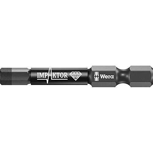 1/4 inch hex drive Impaktor insert bit for hexagon socket screws, 50 mm x 4 mm. The Impaktor technology ensures an above-average service life, particularly suitable for use with impact drivers. The rough Diamond coating reduces the danger of slipping out of the screw recess. Made by Wera.