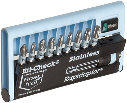 Wera 10 Piece Stainless BC 10/9 Bit-check is designed to keep rust at bay. Wera’s Stainless tool line is manufactured from 100% Stainless steel, preventing extraneous rust caused by use of conventional tools contaminating stainless fasteners. Wera’s unique vacuum ice-hardened process gives the necessary hardness for industrial applications. Wera bit-checks feature a compact design to safely store bits and bit holders in a package that is thinner than the biggest tool contained. So slim it can fit into your shirt pocket. One-handed slide switch opens bit-check for easy tool removal. Sorted by drive and size, tools are easy to locate and return to proper position, making missing products easy to identify. BC 10/9 Bit-check set includes Stainless Rapidaptor with quick-release chuck and 8 Stainless bits, 1 Phillips bit - PH2; 2 Pozidriv bits - PZ1, PZ2; 5 TORX bits - TX10, TX15, TX20, TX25, TX30. Wera ? The Best Tools For The Job!