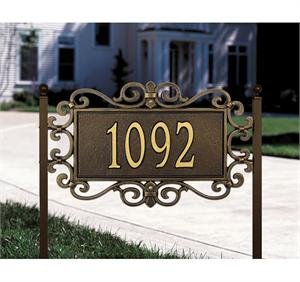メアーズ透かし彫り装飾された銘板のアドレスでは標準と相続したサイズとパーソナライズできる( 1行または2行のテキストが含まれています。住所表札はから米国で手作り、、リサイクルされたアルミニウムを使用。