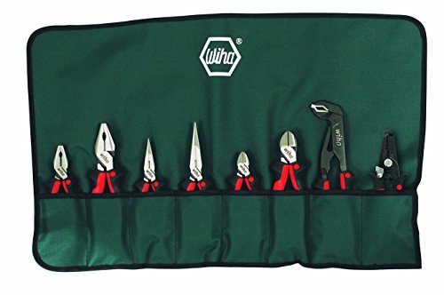 Wiha 30998 ergonomic soft grip industrial set in canvas pouch. Eight piece set includes 6.3' combo pliers, 9' lineman's, 6.3' and 8' long nose and 5.5' diagonal cutters, 8' heavy duty cutter, 10' adjustable pliers and stripper.