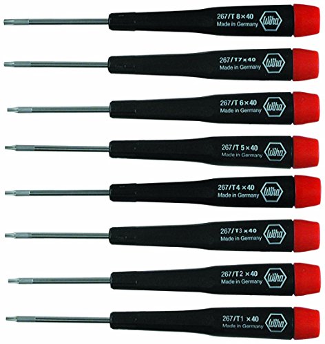 Wiha 20196 precision torx screwdriver set. Eight piece set includes T1, T2, T3, T4, T5, T6, T7 and T8. Rotating finger tip control cap for precise turning control. Molded on soft tactile pico grip handles. Guaranteed Wiha quality, made in Germany.