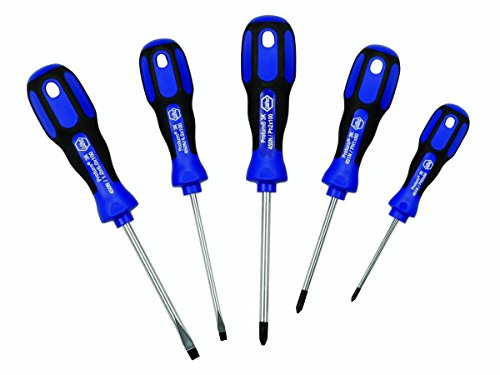 Wiha 46095 five piece 3K Ergonomic Slotted and Phillips Set. Includes slotted 4.0, 6.0 and phillips 0, 1 and 2. Blade high alloy chrome-vanadium-molybdenum steel, hardened, nickel-plated. Molded on ergonomic 3K series handle, soft grip, impact resistant.
