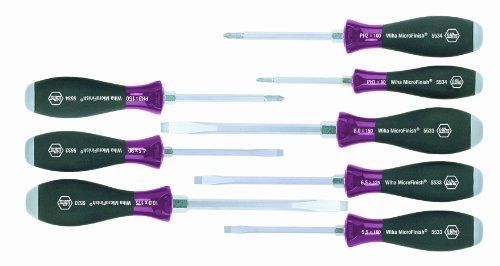 Wiha 53398 eight piece MicroFinish heavy duty set slotted and phillips screwdriver set. Includes slotted 4.5, 5.5, 6.5, 8.0 and 10.0mm. Phillips screwdriver 1, 2 and 3. Round blade high alloy chrome vanadium molybdenum steel, hardened, chrome plated. MicroFinish handle, cellulose-acetate, impact resistant, non-slip, oil and grease resistant. With striking cap.