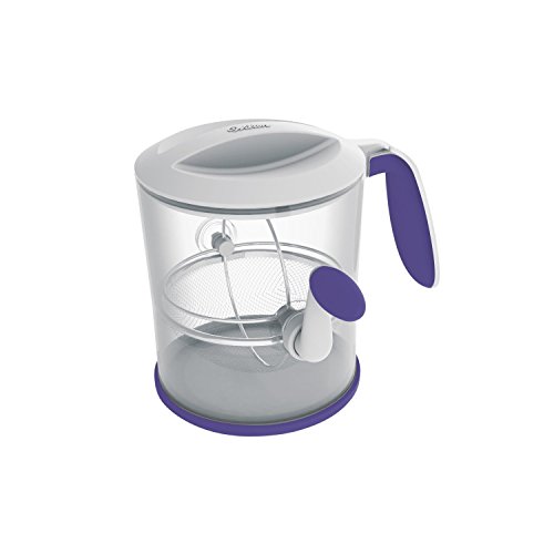 Efficiently sift flour using the easy-turning handle! Sifter holds up to 2-1/2 cups of pre-sifted flour. Package includes cover, removable turn handle, comfort handle and non-slip bottom.
