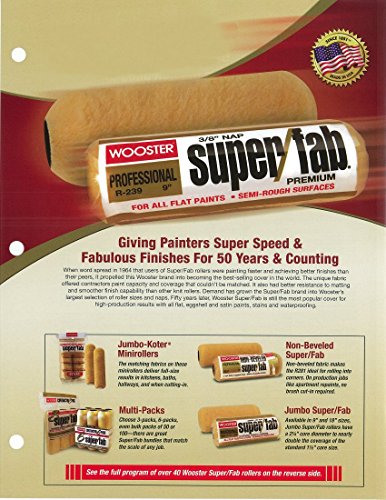 Super/Fab is the best-selling professional roller cover in the world and it's easy to see why. It features a proprietary fabric blend that delivers paint capacity and coverage you won't get from any other cover, while its famous buff-colored fabric resists matting for a smoother even finish. For more than 40 years, painters everywhere have chosen Super/Fab for the highest quality production with all flat to satin paints, stains and waterproofing sealers. Available only form Wooster. The Wooster Brush Company has been manufacturing innovative, high-performance painting tools right out of Wooster, Ohio USA since 1851. Our trade names include Ultra/Pro, Advantage, Yachtsman, Shortcut paintbrushes; Super/Fab, Super Doo-Z roller covers; Sherlock frames and extension poles; Jumbo-Kotler minirollers; and Prep Crew surface prep tools. You can feel confident knowing Wooster is the name behind your painting tools.