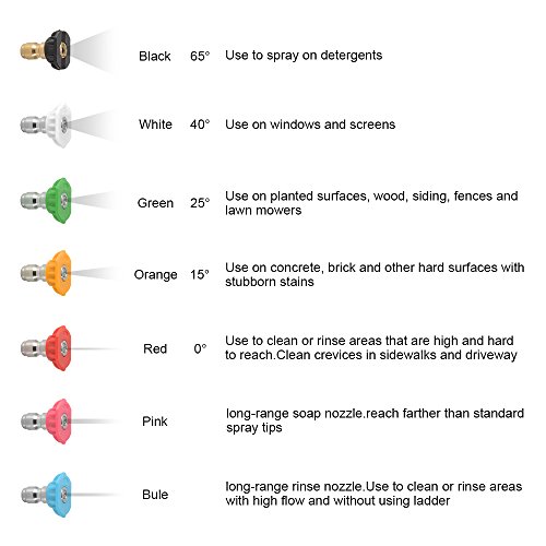 - 5広範囲のスプレーパターンと用途のためのノズルチップ。様々な石鹸や化学製品に最適です。簡単に接続して取り外します。 (0°、15°、25°、40°、65°)