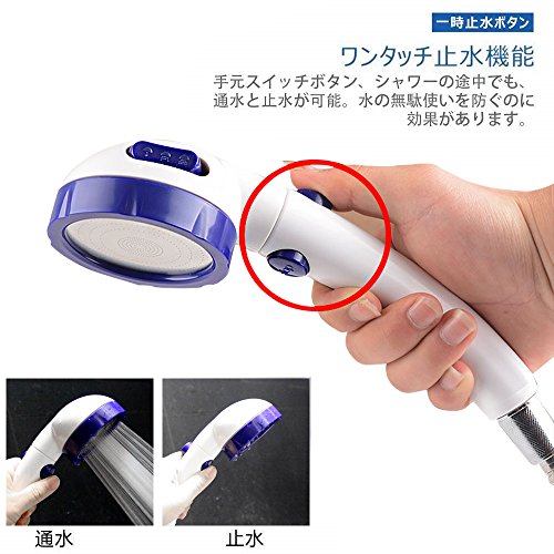 - 【ストップボタン】シャワーヘッドのネックにストップボタンがあり、手持ちでシャワーの途中でも、ワンタッチで通水と止水が可能です。目を閉じたままでも操作できる、止水通水が自由自在、お湯を無駄にしない。