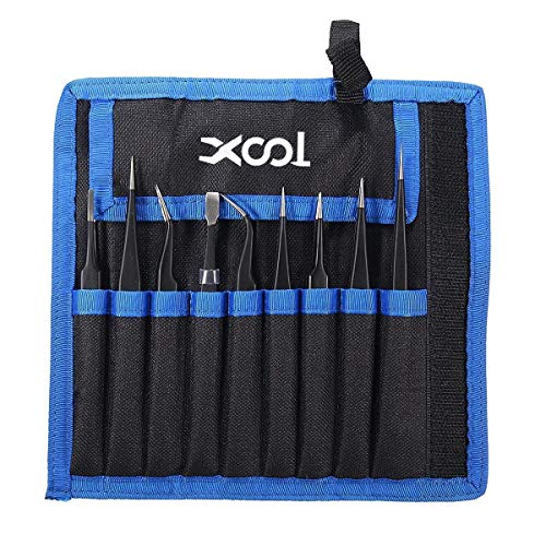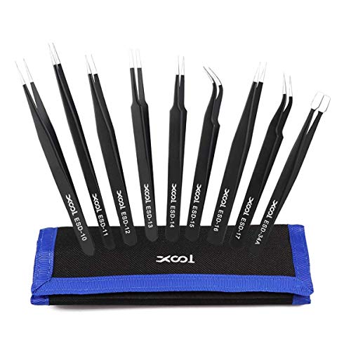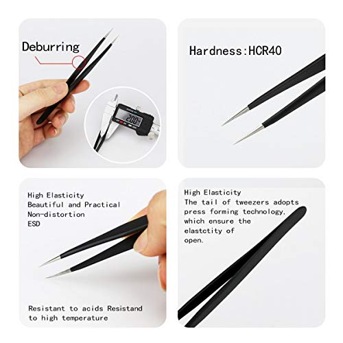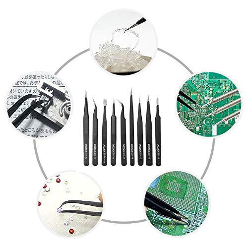 (9in1) - ESD Tweezers Tools Kit, Precision Anti-static Set of Tweezers, Non-magnetic and Multi-standard Stainless Steel Tweezers with Storage Bag for Lab, Electronics, Jewellery and Detailed Work