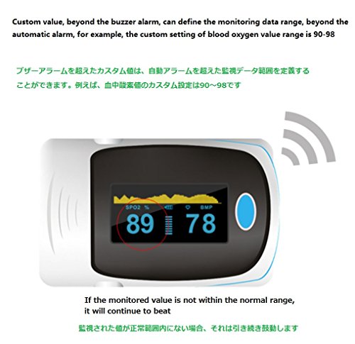 - *サウンドアラームインジケータ:あなたのSpO2とPRの状況を監視するためのスマートなサウンドアラームシステム。不規則な値(より高いまたはより低い値)が検出された場合、それはあなたに注意を促す警告を発する。