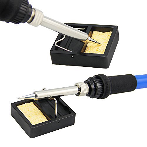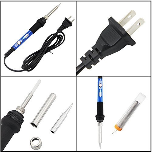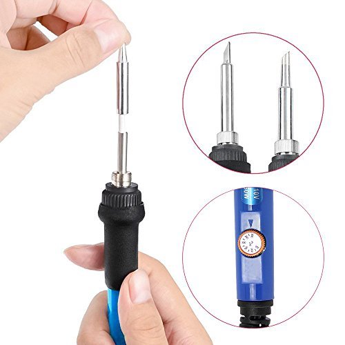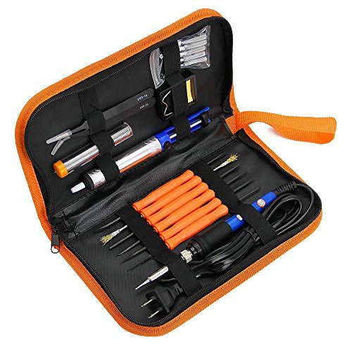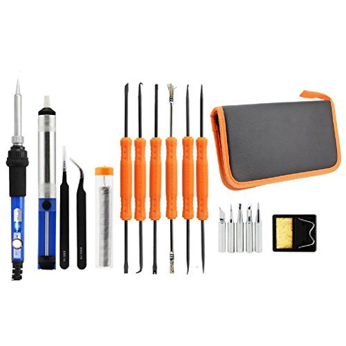 - 【18in1品物豊富】1×はんだごて本体、5個交換コテ先、1×鉛フリーはんだ、1×ハンダ吸い取り器、2×帯電防止ピンセット 、1×こて先クリーナー付半田ゴテ台、6×補助ツール、1×収納ケース