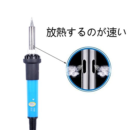 - 温度調節ではんだゴテをコントロールでき、200~450摂氏度、特別な定温電気回路で温度をコントロールし、はんだゴテにあるノブで温度調節できる。