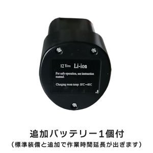 - パワフル12V充電池で1個のバッテリーで3~5時間充電により約30分・予備バッテリーも充電にて最大約1時間の連続稼働が可能