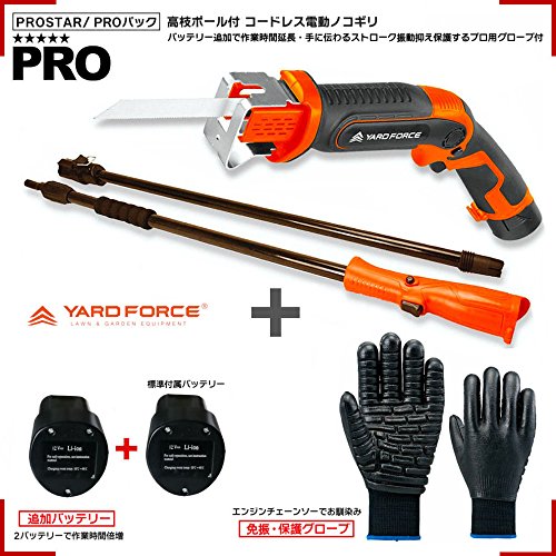 【Professional】 YARD FORCE 高枝切りポール付 コードレス電動2WAYノコギリ(ハンド・高所ポール)+ 「予備バッテリー(バッテリー全2個付)/プロ使用ストローク振動免振グローブ付」 【PROSTAR/Pro-Pack】