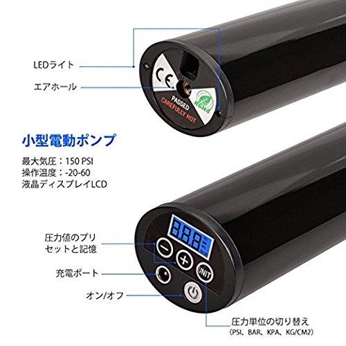 - 【 タイヤ圧力】インフレーターを完全に充電するために、およそ1.5時間が掛かります。自転車やオートバイにも、それぞれおよそ2分、3分ぐらいが掛かります。最大の圧力は150PSIで、正確さは+/-0.5PSIです。設定した空気圧になると自動で停止します。