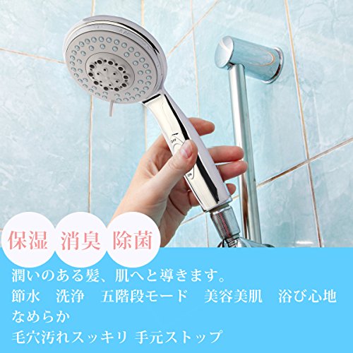 シャワーヘッド 節水 美髪 手元ストップ 五段階モード 取り付け簡単 工具不要 ストップボタン 国際汎用基準G1/2 バス用品
