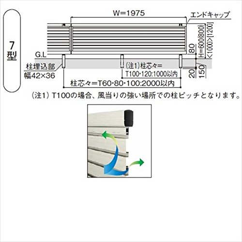 ●T100で風当りの強い場所、T120のフェンスと取付けする場合、支柱は本体1枚に2本(=1mピッチ以下)、コーナー部・端部では必ず3本ご使用下さい。