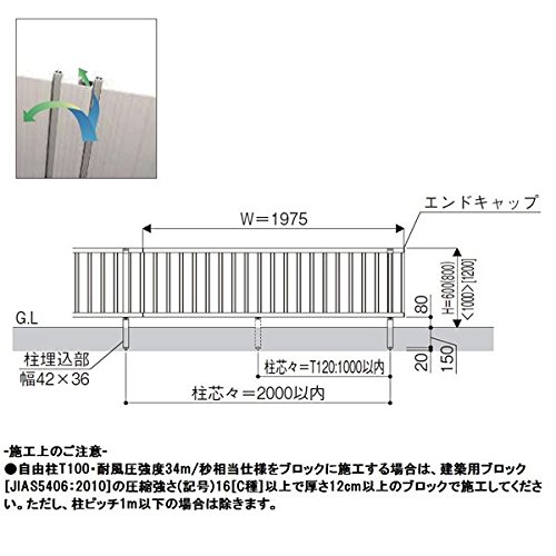 ●自由柱T60・80・100の支柱は、本体1枚に1本(2m=ピッチ以下)、コーナー部・端部では必ず2本ご使用ください。ただし、T100の場合、風当たりの強い場所では支柱は本体1枚に2本(=1mピッチ以下)、コーナー部・端部では必ず3本ご使用ください。