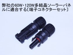 - 弊社で販売中の60W・80W・120W多結晶ソーラーパネルに搭載されている端子に適合する端子コネクターです。