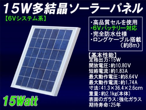 性能詳細:太陽電池タイプ:高品質多結晶シリコン、定格出力:15W(実測10W)、開放電圧:10.80V、短絡電流:1.83A、最大動作電圧:8.64V、最大動作電流:1.74A、表面のガラス:強化ガラス、外枠:耐腐食コーティングアルミフレーム、期待寿命(定格出力の80%を維持):約25年、セルの変換効率:15%以上