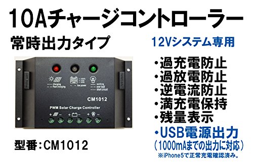 【スペック】 システム電圧区分:12V 定格電流:10A(最大出力電流) 入力可能電圧 ソーラーパネルの最大動作電圧が14V以上~19V以内(開放電圧は17V以上24V以内) 追込み充電電圧(10分間):14.4V(12Vシステム)(誤差±0.2V) フル充電後の維持電圧:13.7V(12Vシステム)(誤差±0.2V) 過放電保護動作電圧:10.7V(12Vシステム)(誤差±0.2V) 再放電開始電圧:12.6V(12Vシステム)(誤差±0.2V) 最大電圧降下:0.2V以下 自己消費電流:12mA以下 出力保護電流:1.25倍の過負荷(12.5A)になった場合、60秒後に出力停止 2.5倍以上(25A以上)の過負荷になった場合、即時に出力停止 USB電源出力:5V 1000mA 端子部対応電線太さ:φ3.5(3.5sqまたは3.5m㎡) サイズ:75×130×37mm(縦×横×厚さ) 重量:約121g