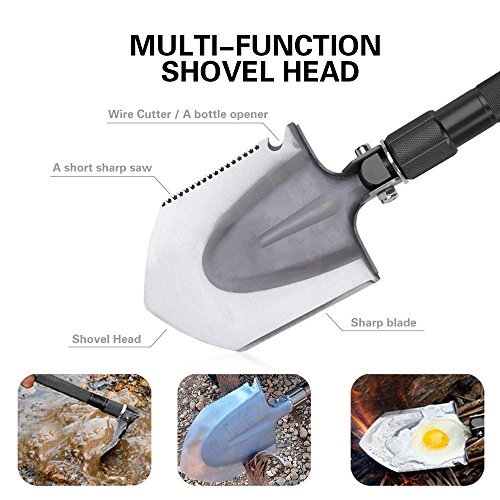 - シャベル、鋸、栓抜き機、鍬、フック、フィッシュスケールナイフ、ドライバー、ファイヤースターター、ガラスブレーカー、安全ハンマー、ホイッスルなど、従来のシャベルには見られないいくつかの特徴があります。