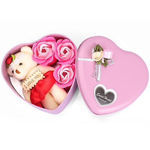 Yobansa 造花 石鹸の花 枯れない お花 薔薇 かわいいクマ 石鹸 バラハート型ギフトボックス 父の日 誕生日 結婚 記念日 卒業 入学 出産 お祝い,3本 (ピンク)
