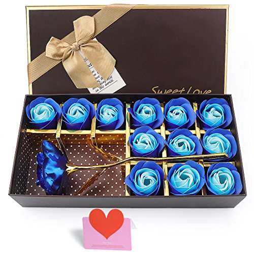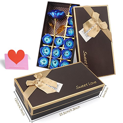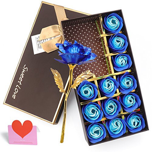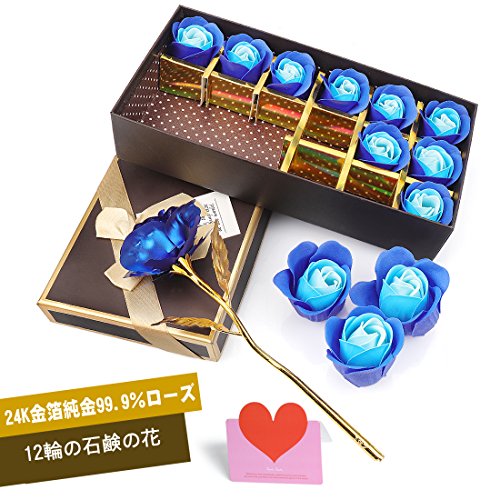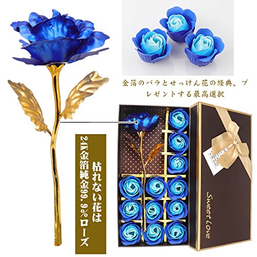 YOBANSA 金箔のバラ 造花 石鹸 花 フレグランス ソープ フラワー プレゼント 枯れない 花 母の日 誕生日 結婚祝い 結婚記念日 大切な人への感謝 メッセージカード付き (2色の青)