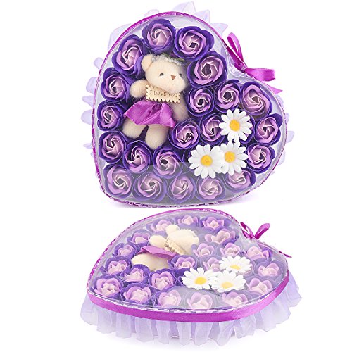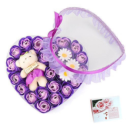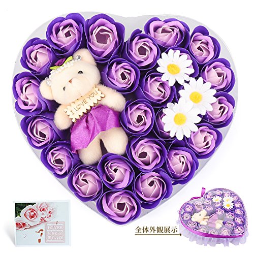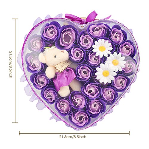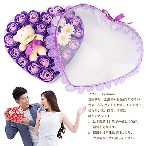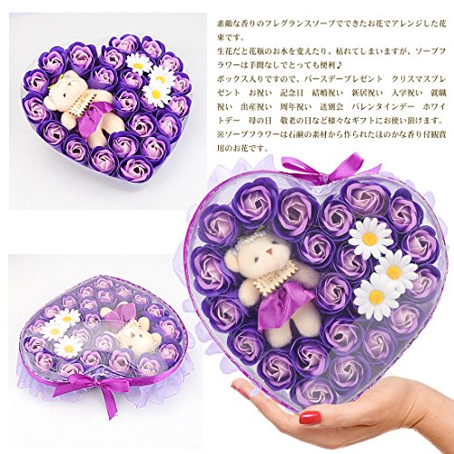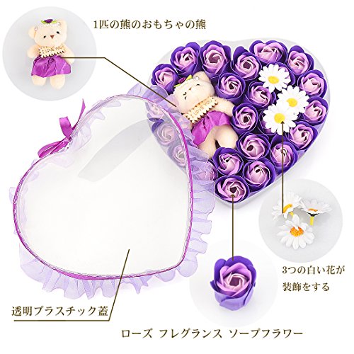 Yobansa 造花 ソープ フラワー プレゼント 枯れない お花 薔薇 かわいいクマ 石鹸 バラハート型ギフトボックス 誕生日 結婚 記念日 卒業 入学 出産 お祝い,18本 (パープル 23本)