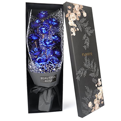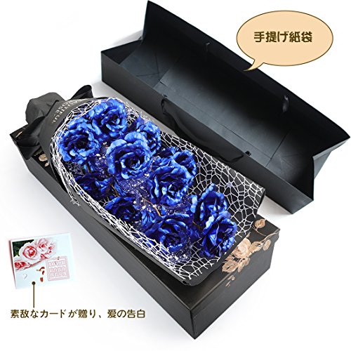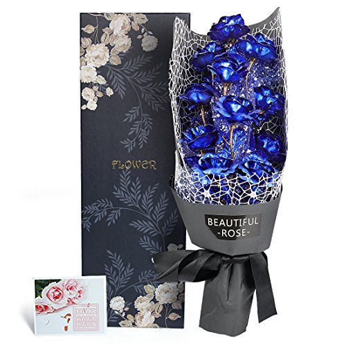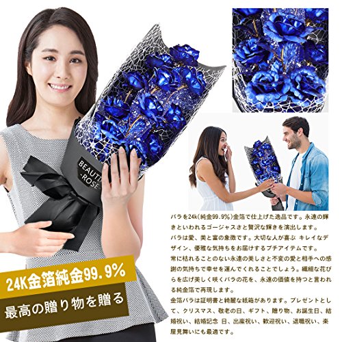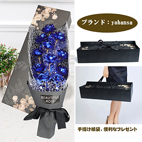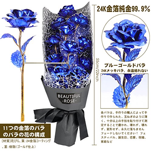 YOBANSA 金箔のバラ 造花 花束 枯れない 花バラ ブーケ プレゼント 結婚祝い 誕生日 母の日 父の日 定年祝い 還暦祝い 新築祝い 送別会 メッセージカード付,11本 (青)