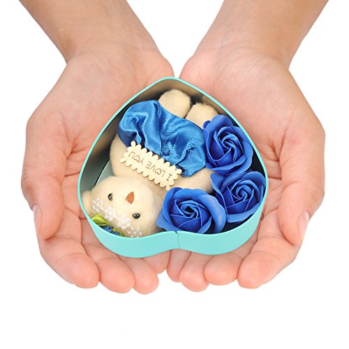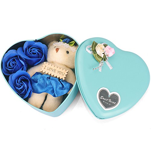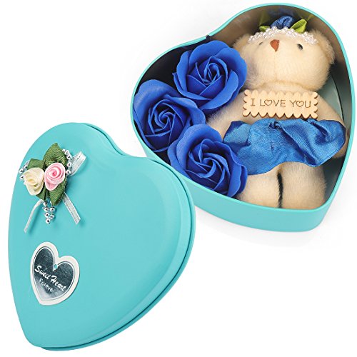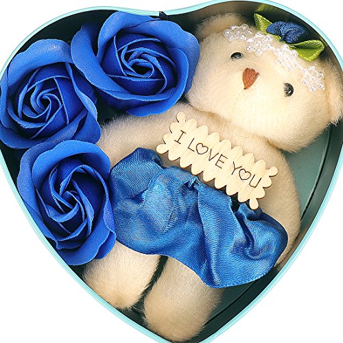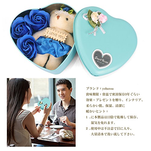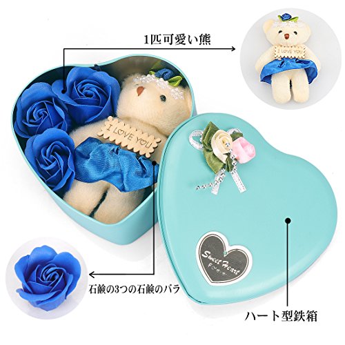 Yobansa 造花 石鹸の花 枯れない お花 薔薇 かわいいクマ 石鹸 バラハート型ギフトボックス 誕生日 結婚 記念日 卒業 入学 出産 お祝い,3本 (藍色)
