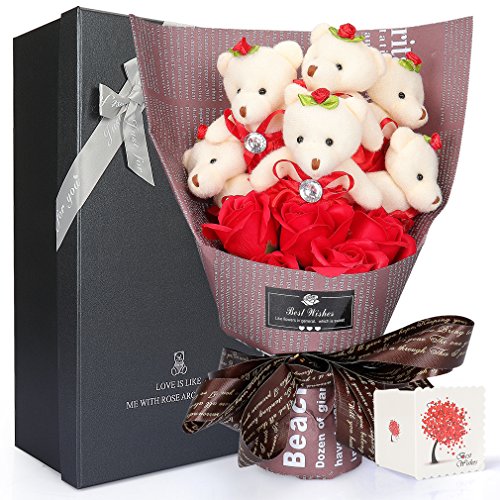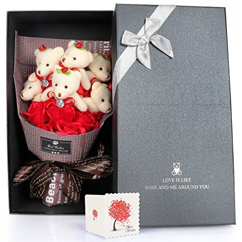 YOBANSA ソープフラワー 石鹸 花 バラ 造花 花束くま束 ベア ブーケ 可愛いぬいぐるみ (ベア6匹,花5匹) 母の日 誕生日 結婚祝い 結婚記念日のプレゼントにお勧め (レッド)