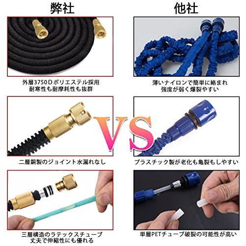 - ☞【チューブ進化】 ◎ 三層構造の天然ラテックスを採用、従来のホースと比べ耐久性5倍なので大安心 ◎ -5℃から40℃までの環境温度に利用でき、温度の原因で摩耗することはありません ◎ 磨耗と高圧にもより優れ、通水中に自動車のタイヤで踏んでも、鋭く尖ったものに接触しても破裂しません