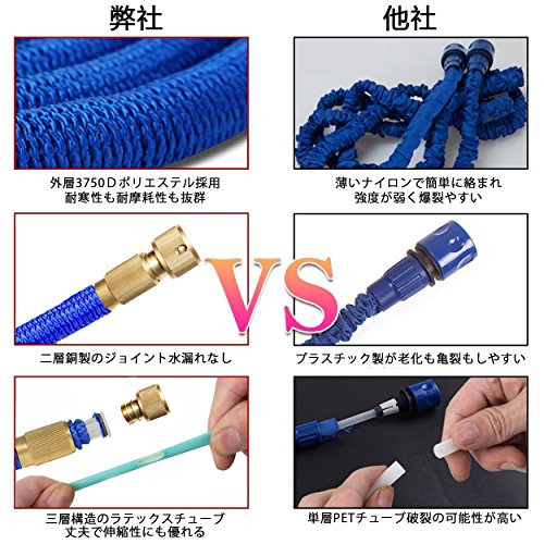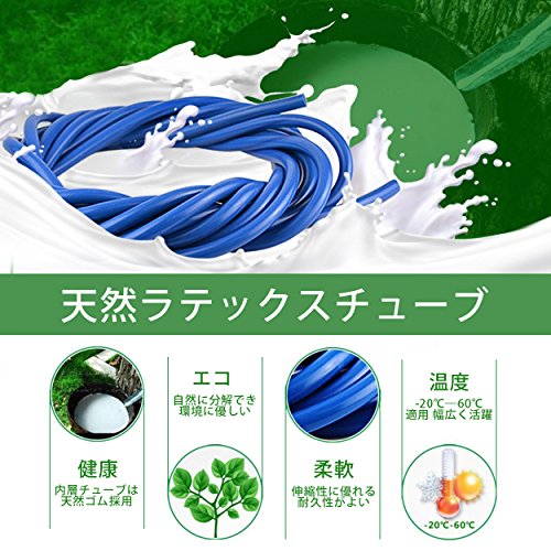 - ☞【チューブ進化】 ◎ 三層構造の天然ラテックスを採用、従来のホースと比べ耐久性5倍なので大安心 ◎ -5℃から40℃までの環境温度に利用でき、温度の原因で摩耗することはありません ◎ 磨耗と高圧にもより優れ、通水中に自動車のタイヤで踏んでも、鋭く尖ったものに接触しても破裂しません