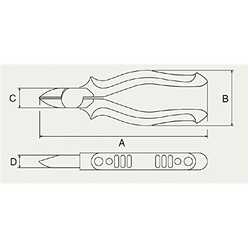 ●強力タイプ。 ●切断能力と耐久性に優れ、電気工事などで幅広く使用されています。 ●エラストマーカーバー付。 【仕様】 ■サイズ(mm):150(6”) ■全長(A;mm):168 ■寸法B(mm):53 ■寸法C(mm):19 ■寸法D(mm):11 ■刃幅(mm):22 ■切断能力(mm):鉄線・2.0φ/銅線・3.0φ/ピアノ線・1.2φ ■重量(g):185 【注意事項】 ※非絶縁工具です。通電中(活線)の作業には使用しないでください。感電の恐れがあります。 ※安全の為、保護メガネを着用ください。